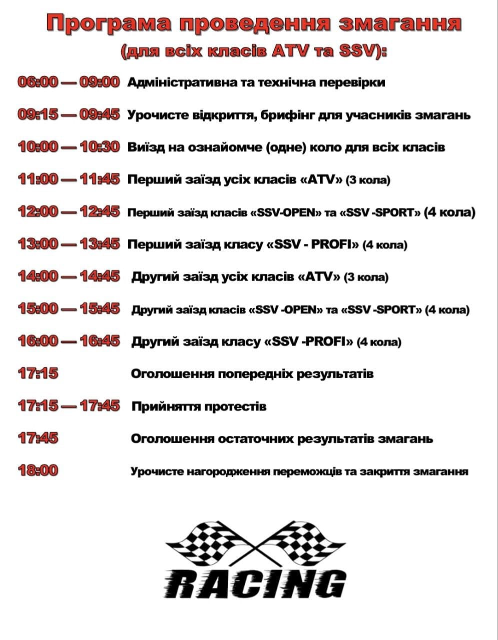 ATV – Квадроцикли з об’ємом двигуна від 250 сс до 1000 сс включно з варіатором – учасники від 14 років включно; Наявність спортивних розрядів та звань не регламентується