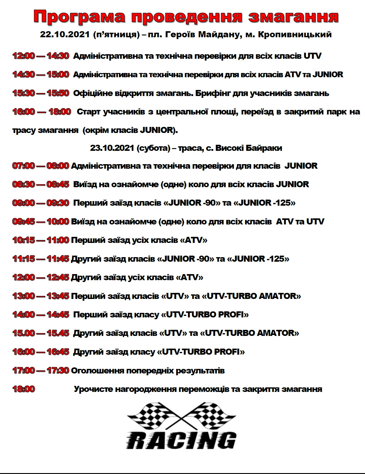 У п’ятницю 22 жовтня з 12:00 на центральній площі м. Кропивницький буде проходити реєстрація учасників, виставка спортивної техніки, фотозони, шоу-програма, і звичайно урочистий проїзд колони учасників по місту до траси проведення змагань в с. Високі Байраки. А в суботу 23 жовтня з 8:00 вас чекає цілий день видовищних змагань, заряд адреналіну і екстриму, урочисте нагородження переможців та святковий феєрверк!